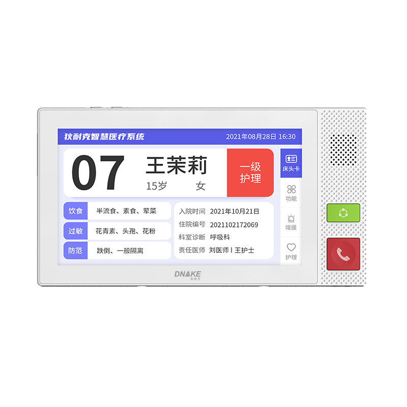 安裝在病床頭的交互設(shè)備機,代替?zhèn)鹘y(tǒng)紙質(zhì)卡。產(chǎn)品支持呼叫對講、為住院患者提供病例查詢、狀態(tài)自動提醒等護理需求等。