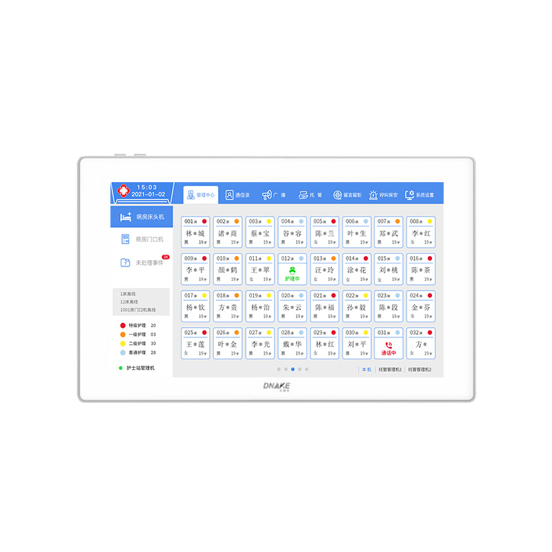 16)雙模對講:服務器正常連接時,床頭分機與管理機可以雙向呼叫通話對講;當服務器宕機的時候(可以拔掉網(wǎng)線,等幾秒鐘后),病床分機仍然可以呼叫到護士站管理機,病房門口機也可以呼叫到護士站管理機;都可以進行通話對講。