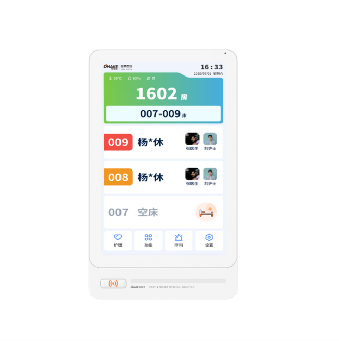 設(shè)置在病房門口的終端設(shè)備,主要用于顯示病房相關(guān)信息,內(nèi)置簡易醫(yī)護(hù)工作站,支持病房床位一覽、患者動(dòng)態(tài)跟蹤、呼叫對(duì)講、增援求救等多種呼叫類型,信息齊全,及時(shí)響應(yīng)醫(yī)護(hù)需求,實(shí)現(xiàn)智能化醫(yī)護(hù)管理。