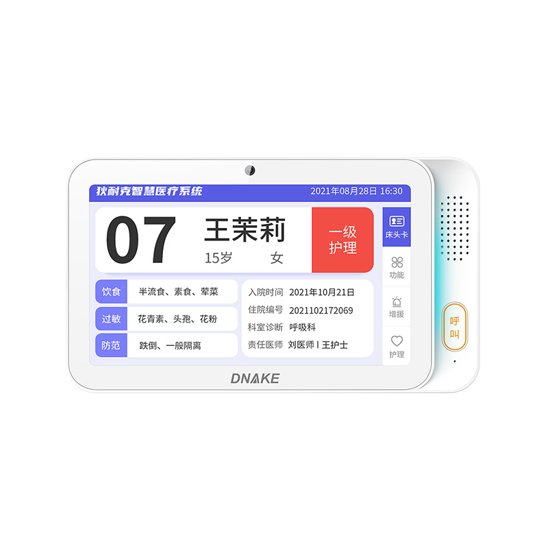 安裝在病床頭的交互設備機,代替?zhèn)鹘y(tǒng)紙質卡。產品支持呼叫對講、為住院患者提供病例查詢、狀態(tài)自動提醒等護理需求等。